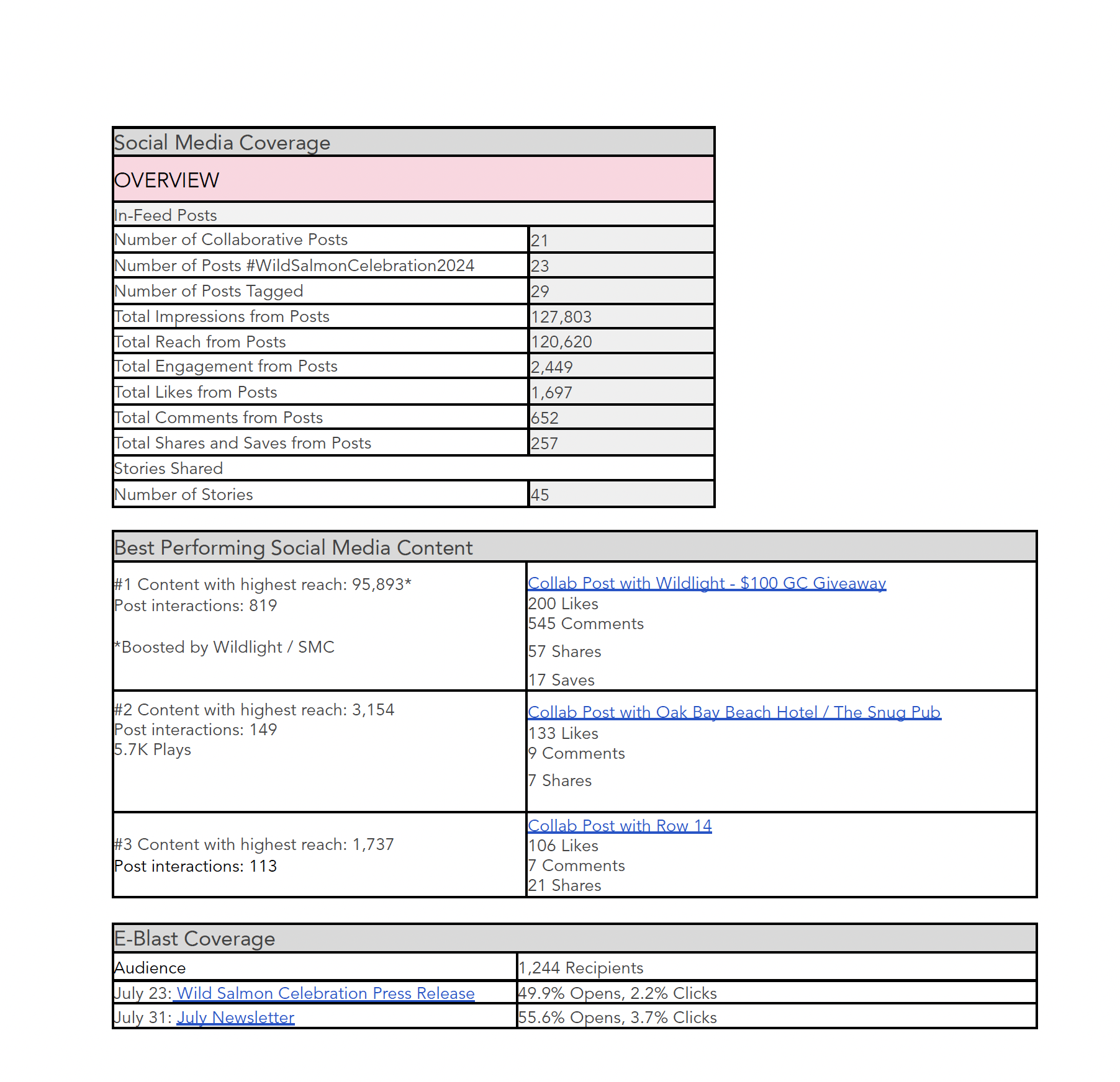 We collaborated with a PR company to organize an event aimed at educating attendees, fostering brand awareness, and sustaining interest in wild BC salmon throughout the summer. The event hosted 24 media representatives, including chefs Robert Clark and Julian Bond, who created recipes to showcase the versatility and importance of wild BC salmon. The media reach was fantastic, amplifying the message and engaging a wide audience.