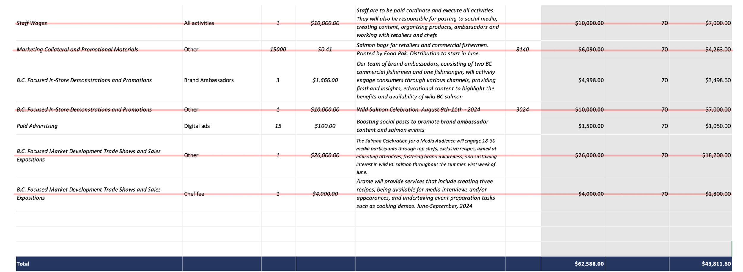 We recently faced a stock shortage of our Salmon bags but took the opportunity to reprint them with the BuyBC logo, ensuring this project aligns with the program’s requirements. A total of 16,500 bags were printed, and we’ve already distributed 7,000 bags (14 cases). Our new distribution system with Foodpak has proven to be more efficient, significantly reducing shipping costs.