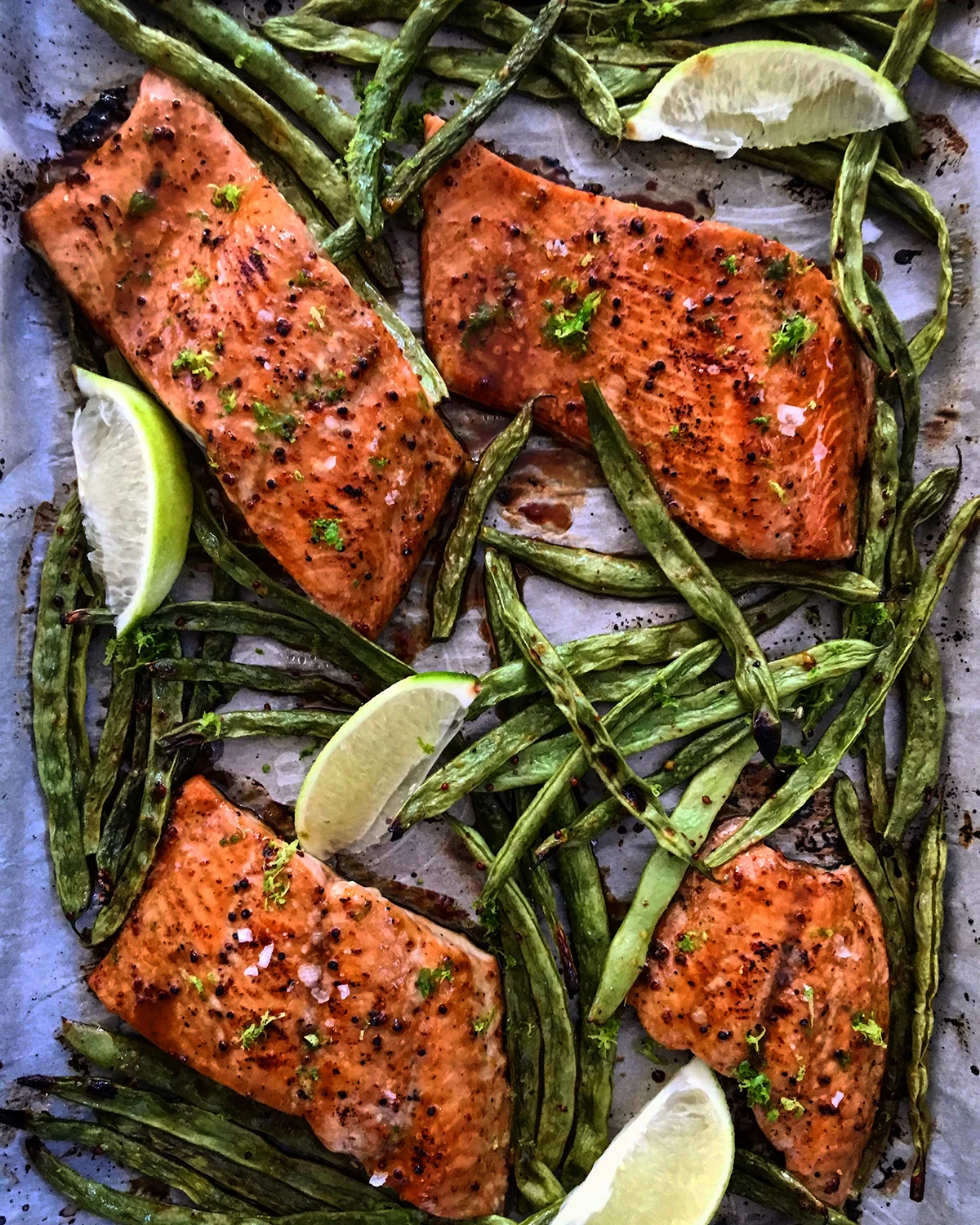 - Cut your salmon into what ever portions you want (we find a full fillet makes 4 big ones, or 6 smaller ones). Place it on the baking sheet. Take cleaned green beans and dress them in 3 tbsp of the glaze from the pot. Toss and coat well. Arrange on the pan with the salmon. Glaze salmon generously as well.