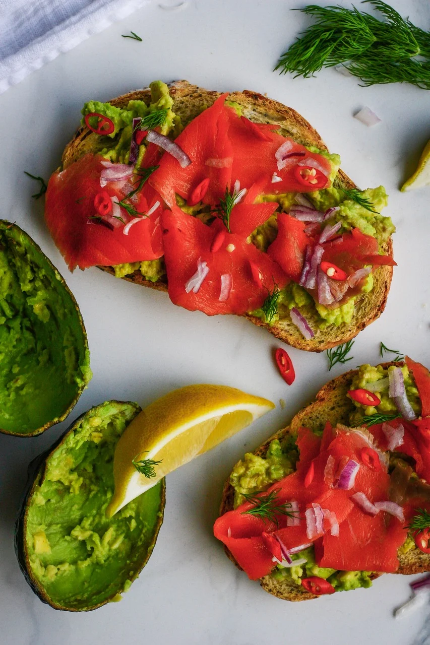Spread avocado over toast. Layer (as much or as little) Lox onto the avocado and then top with whatever you would like, as much as you wish!